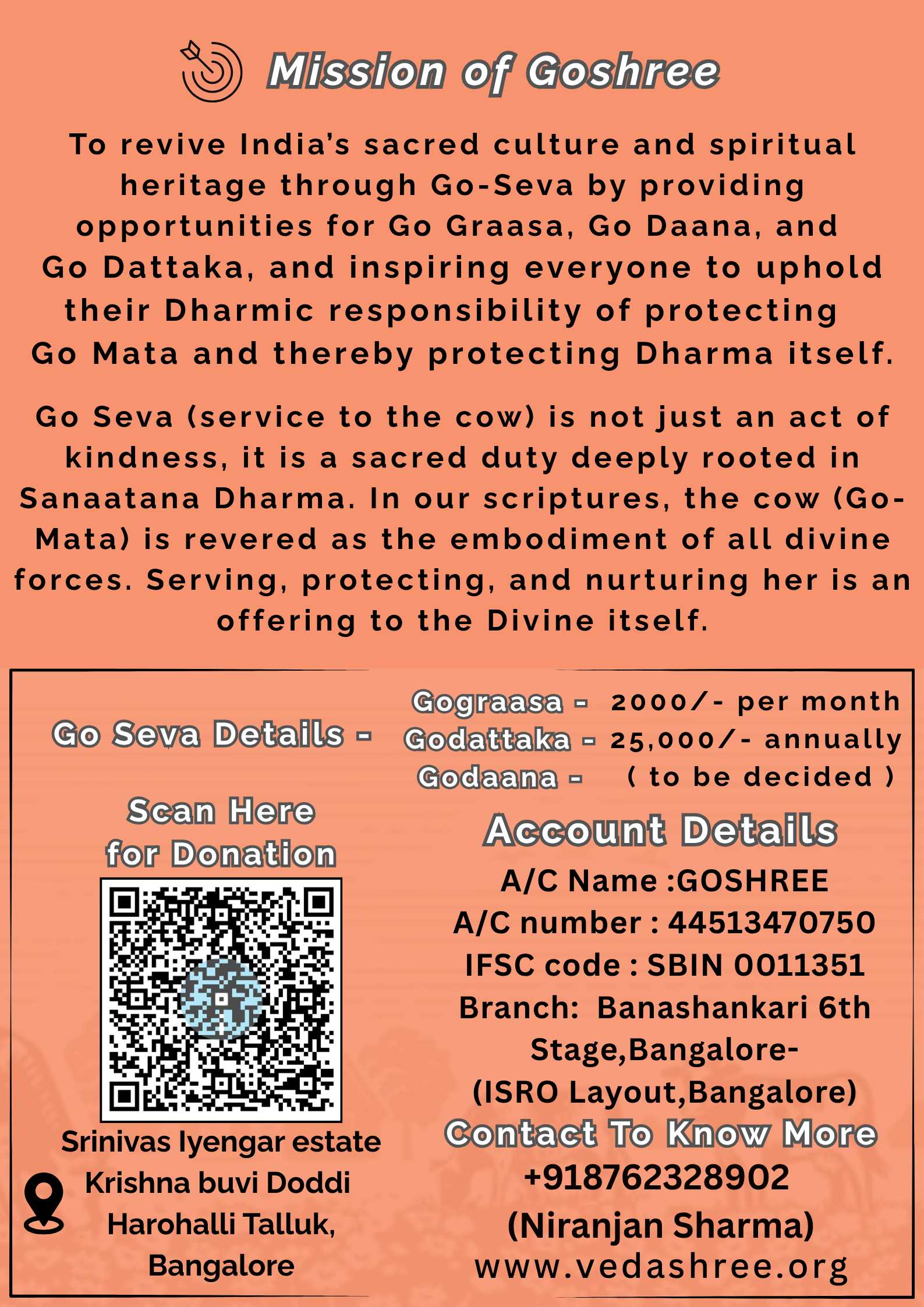 To revive India’s sacred culture and spiritual heritage through Go-Seva — by providing opportunities for Go-Grāsa, Go-Dāna, and Go-Dattaka, and inspiring everyone to uphold their Dharmic responsibility of protecting Go-Mātā and thereby protecting Dharma itself.